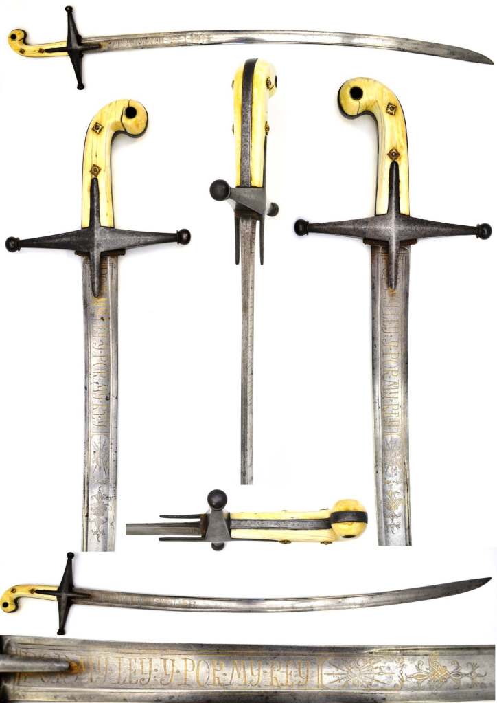 Spanish MAMALUKE SWORD with Ivory hilt with two brass rosettes each side with a plain steel cross guard. Blade length 32” (81 cm) Slight curve, two fullers one narrow near back edge, the other broad down the centre of the blade. Etched in large gilt lettering at forte “POR MY REY Y POR MY REY” (For my law, for my king) referring to King Charles IV of Spain. No scabbard but very good condition.
