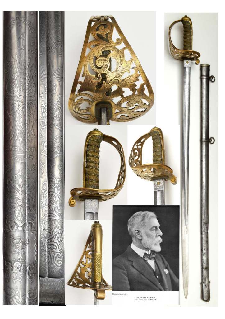 British 1857 Volunteer Engineer Officer’s sword made for Lieutenant-Colonel and Honorary Colonel Henry T. Crook of the 1st Lancashire Engineer Volunteers around the end of 1885. Retailed by Hobson & Sons of London, who were operating from Little Windmill Street in London. The 32 1/2 inch blade is in excellent condition with etched scrolls, crowned VR and Lancashire 1st Engineer Voltrs as well as Henry’s initials and crest. The blade is in excellent shape, with no pitting or rust stains whatsoever and has never been sharpened, and is perfectly straight and tight, as well as very well-balanced. The blade is firm in the hilt, the shagreen (sharkskin) is has faded but still in very good condition, the twisted grip wire bindings very good, one of the small strands is loose on the upper turn. The scabbard has seen wear, and has light pitting, as well as several dents but still in very good order. The only negative is the inside of the guard has been very slightly bent, but it is really barely noticeable.
