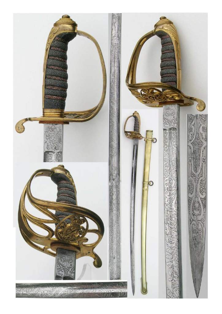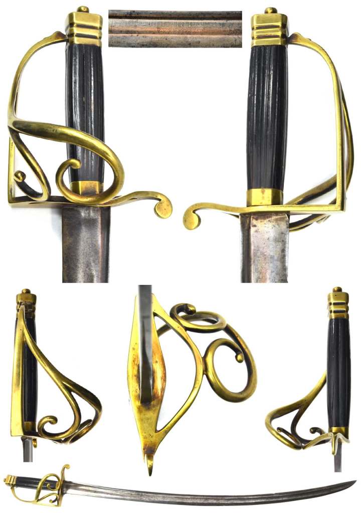 1796 Infantry or Naval Marine Officer’s Sword. Blue & Gilt curved bright blade, etched in gold with Royal Cypher, Coat of Arms, Helmeted Bust & trophies, obverse side GR, Royal Cypher & trophies RUNKEL SOLINGEN to back edge; gilt brass stirrup knuckle bow quillion & languet, back piece & ears; original grips with woven silver wire binding; with unsigned gilt brass mounted black leather scabbard. Naval style light fish skin grip.