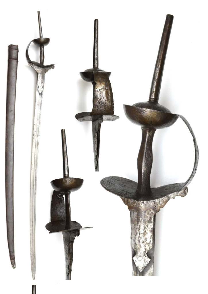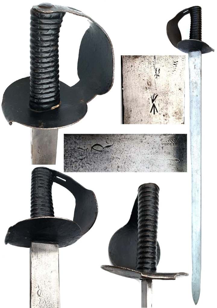 A SWEDISH INFANTRY SWORD, CIRCA 1685 with tapering double-edged blade of flattened-hexagonal section (the blade shortened for Naval use in 1832), struck with three marks at the forte and a proof mark, the letter P at the front, rudimentary blackened iron hilt (areas of patination), comprising guard drawn-out to a short straight quillon and pierced at the rear, frontal guard bar and knuckle-guard joined at the top (thumb-loop removed), spherical pommel, and the grip with an early binding of plaited brass wire covered in black leather between Turks Heads.