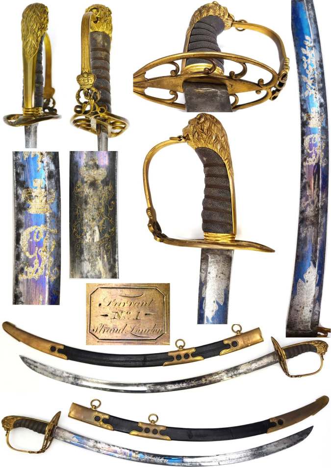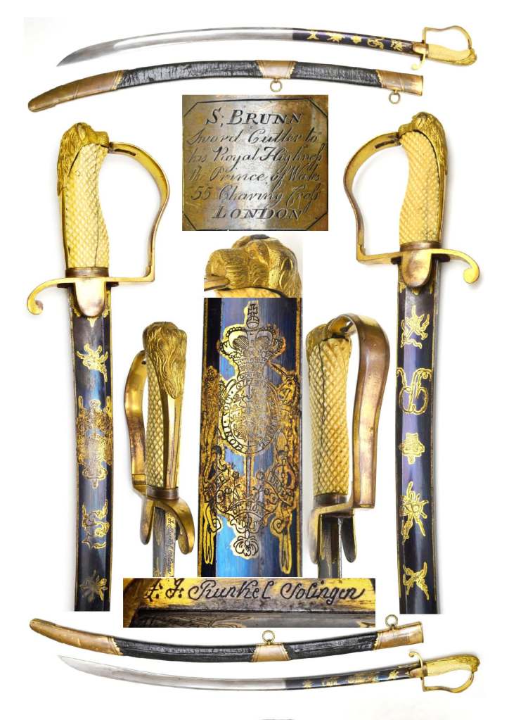 1796 Flank Officer’s Blue and Gilt Sword by Brunn. Brunn, Samuel traded at 55 Charing Cross from 1799 to 1803. Curved blade by Runkel Solingen; 85% blue & gilt remaining, extending to almost half of the blade; with trophies, cipher, GR; obverse side Royal Coat of Arms & trophies; back edge engraved J.J. Runkel, Solingen. Stirrup hilt & lion’s head pommel; 70% gilt to back piece, guard & languets. Chequered ivory grips with two fine aged cracks and a small chip at the pommel. Gilt brass mounted black leather scabbard, repaired at seam; locket engraved “S. Brunn Sword Cutler to his Royal Highness the Prince of Wales 55 charring cross London”.