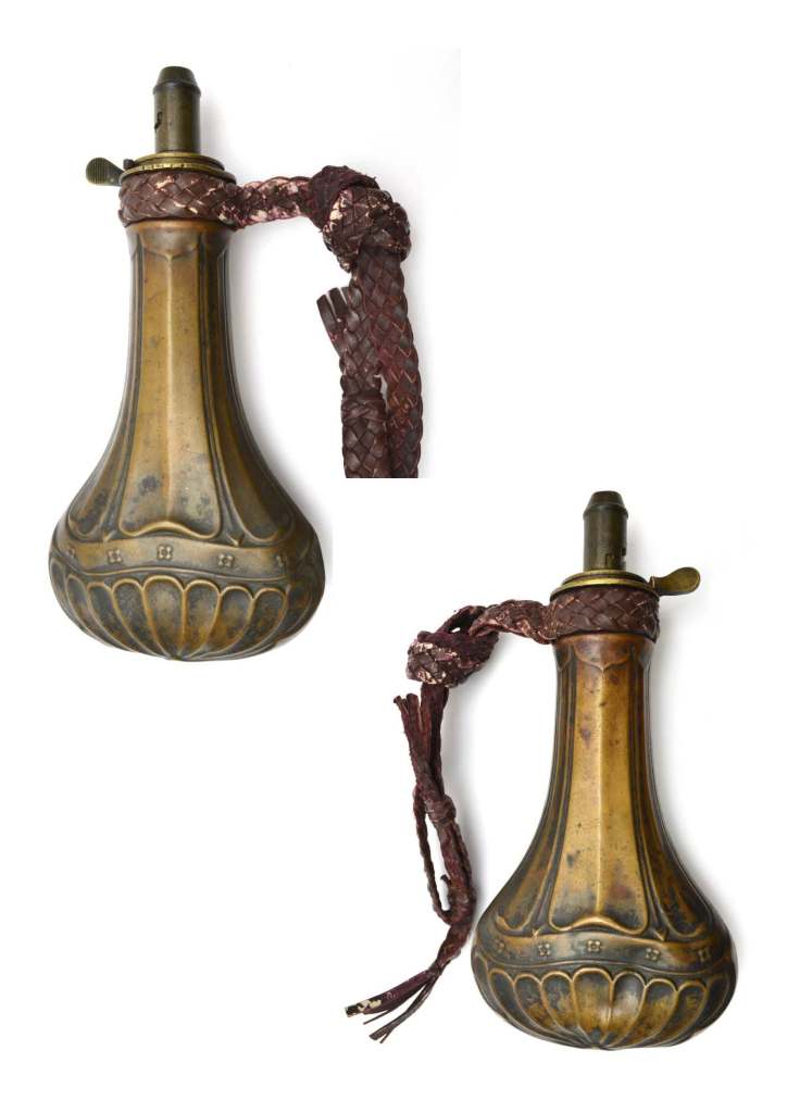 British Brass Powder flask by Hawksley, Riling’s reference number 284. The neck of the flask is fluted, topped with floral decoration. The middle is dissected by two decorative bands with floral decoration in the centre panel and the bottom of the flask.