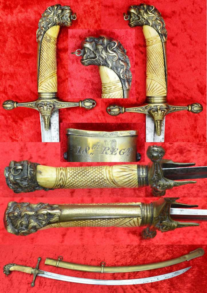 Mameluke Band Sword for a Non Commissioned Officer of the 18th (Royal Irish) Regiment. Mameluke sword with Lion head pommel, embossed brass mounted ivory grip, curved fullered blade, brass scabbard engraved “18th regiment”. The overall length of the sword in its scabbard is 33 ¼” 84.4cm and the blade is 33 ¼” 84.4cm.