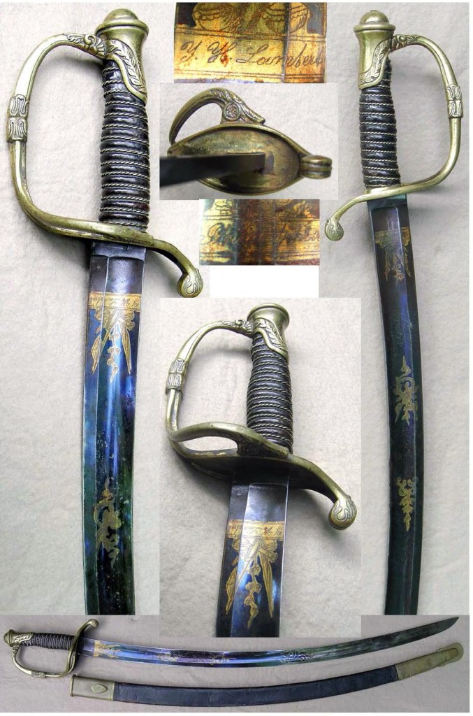 Curved sabre retailed or made by J.H. Lambert of Philadelphia. The blade is decorated in blue and gilt panels containing floral designs, flags and drums and was probably imported from Germany by Lambert. The pommel and guard are brass with acanthus decoration. The grip is leather covered and has two twisted stands of copper wire bound around the groves. The fuller run right along the upper curve of the blade and is quite wide. Philadelphia is engraved at the head of the blade on one side and the maker’s name on the other. The scabbard original to the sword has brass fittings and a frog in the early Marine Officers style. A fine example of a non-contract foot officer’s sword from J.H. Lambert. Listed as an independent sword maker of Philadelphia from 1830 to 1853. During the American Civil War years, there is a military supply company listed as Lambert & Mast reference (Peterson).