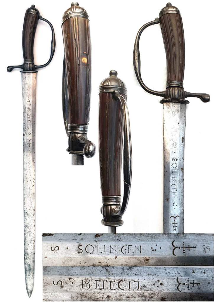 17th CENTURY GERMAN HUNTING Sword. Double edged unfullered blade engraved MEFECIT & obverse SOLINGEN; clear Armourer’s mark to both sides; silver grey patina blade; silver D guard with minor edge damage to shoulder washer; one piece fluted horn grip, 2 insect holes, silver mounted. Blade appears to be a period cut down sword blade and the shell guard is missing.