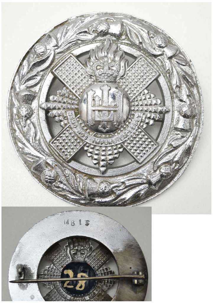 Chromed white metal, Royal Highland Fusiliers piper’s plaid brooch as worn by the pipers of The Royal Highland Fusiliers in No. 1 Dress. This pattern of plaid brooch was worn by the pipers of The Royal Highland Fusiliers from their formation in 1959. This plaid brooch, measures 3.3/4″ [95 mm] in diameter.