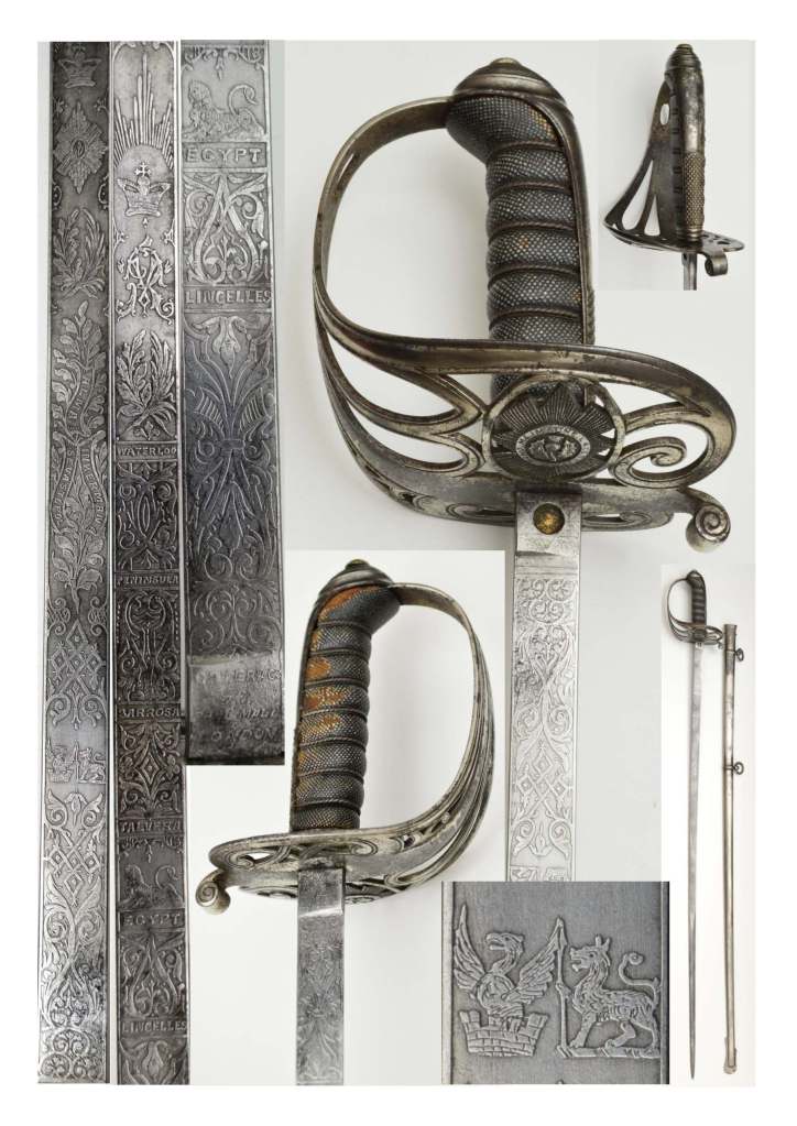 Scots Guards Levee 1854 Pattern Officer’s sword. Straight narrow etched blade with grey finish & clear etchings; by Carter & Co London to ricasso; VR & Royal Cypher & battle honours of Waterloo, Peninsular, Barrosa, Talvera, Egypt, Lincelles; obverse side Royal Cypher & Scots Guards Regimental badge, battle honours of Alma, Inkerman, Sevastopol. Plating showing wear to steel guard with Regimental badge inset; worn fish skin grips bound with silver wire; complete with steel scabbard, plating worn and discoloured. The blade also bears dual crests which include “Family crest featuring Winged Eagle on a Parapet & a Lion holding a Spear.”