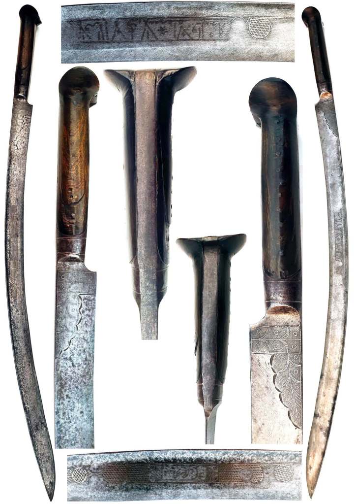 YATAGAN Turkish sword. Early 19th century, floral design near grip & Arabic script on blade. Horn grip, recurved very aged blade, probably circa 1800.