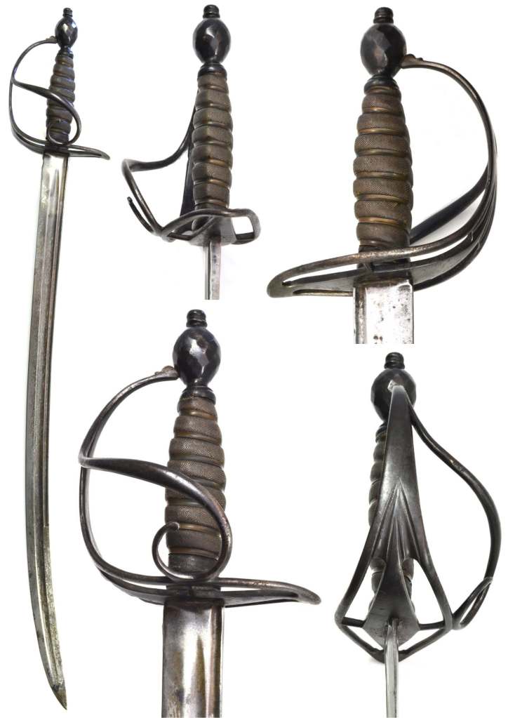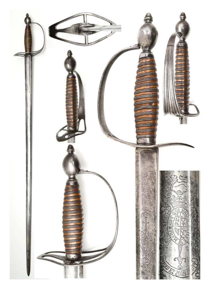 Infantry-English-c1770-Officers Sword Four Quarter Hilt. It is essentially a wide “D” guard with a rounded quillon and four pierced panels – two opposite each side of the grip. The back face of its knuckle bow carries vertical fluting. The straight blade has the royal coat of arms on both sides. It’s typical light back blade includes one wide fuller. The bound is constructed of copper bands with a combination of silver and brass ropes.