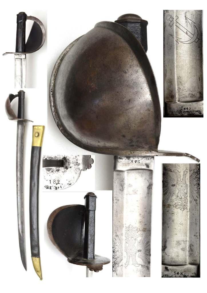 Austrian 1849 naval cutlass. Blade has a two-headed Austrian eagle on one side together with the firm’s stamp: Sand K (S&K). An anchor on the other side with the date 1849, 182 and letters K M stamped under the guard. Grip is wooden, covered with metal plate and ends in an iron cap and a Iron asymmetrical hilt. The scabbard is stamped 121, covered with black leather with brass fittings.