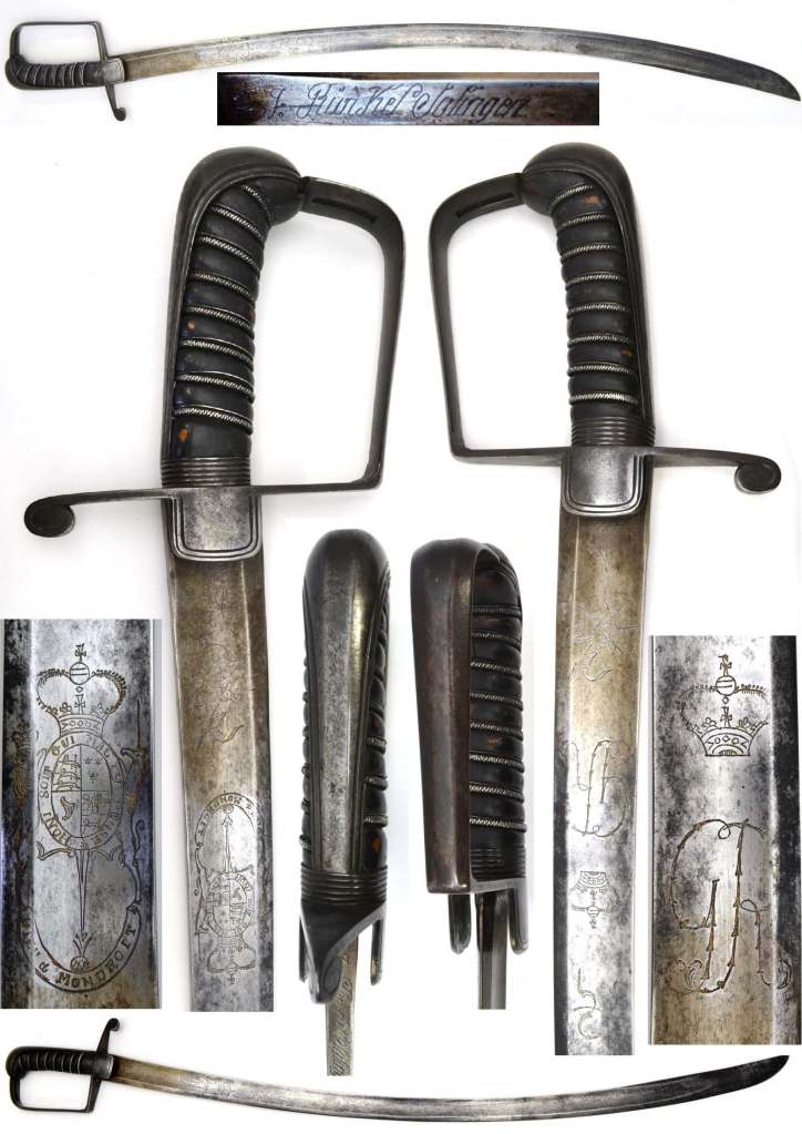 British 1796 Light Cavalry Officers Sword by J. J. Runkel Solingen. Wooden grip has silver wire with its complete leather wrapping. Hilt is of fine form with a multi-faceted knuckle guard & backstrap. The hilt has engraved edging and unusual square Langlets. The curved blade has a single shallow fuller each side that runs from the hilt to within 4” of tip. The blade overall has light staining and nice patina, and has engraving on both sides with remaining traces of gold gilding within the engraving. The left side shows the royal coat of arms, floral work & a stand of arms. The right side has floral work, a crown over GRIII cypher & a stand of arms. The spine of the blade is engraved with the makers name J. J. Runkel Solingen. No scabbard.