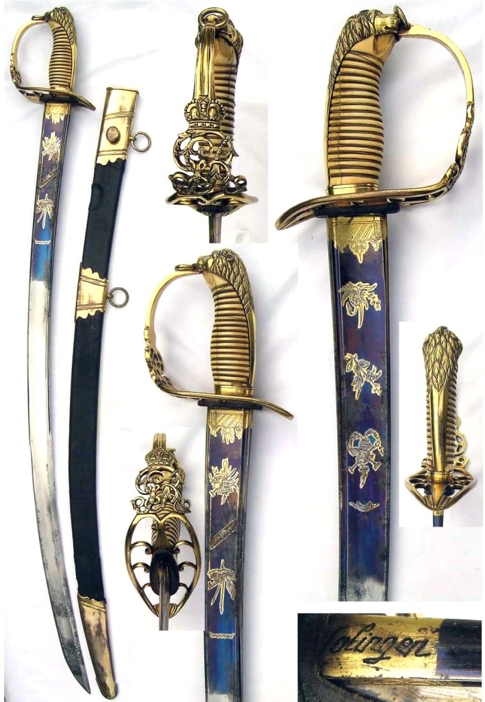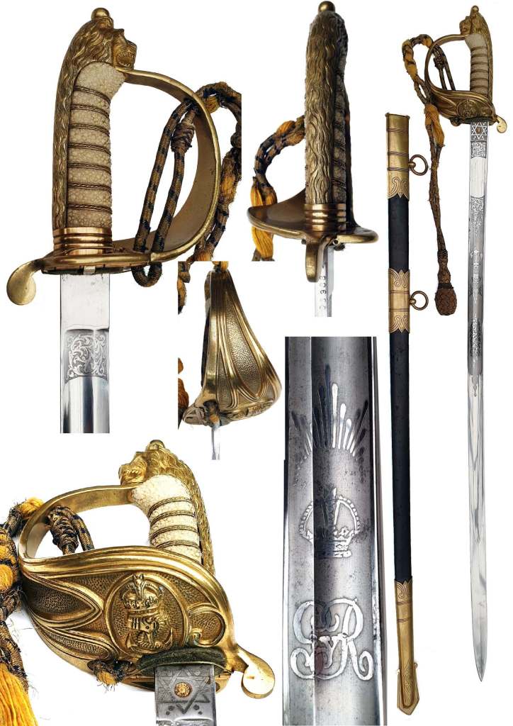 Lion Head Pommel, faceted backstrap & strung Bugle over Royal Cipher on Guard. Blade faint traces of blue & gilt decoration in the form of repeating half-moons decreasing in size ends with 3 Chevrons. Scabbard black leather, gilt mounts, chape, marked “Reddell Sword cutler and Co to their R.H. the Prince of Wales Dukes of Suffix & Cambridge 138 Jermyn Street London”.