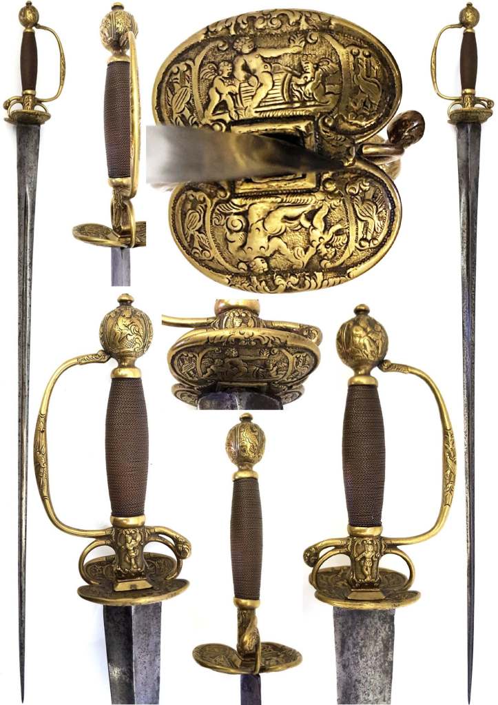 British Small Sword Circa 1720. Brass hilt, double-edged blade. High quality brass hilt; knucklebow featuring a Clasical figure & decoration. Tight wire grip with brass ferrules. Pommel and shells with classical scenes, gargoyle-head quillon finial. Overall Very Good condition.