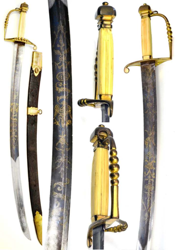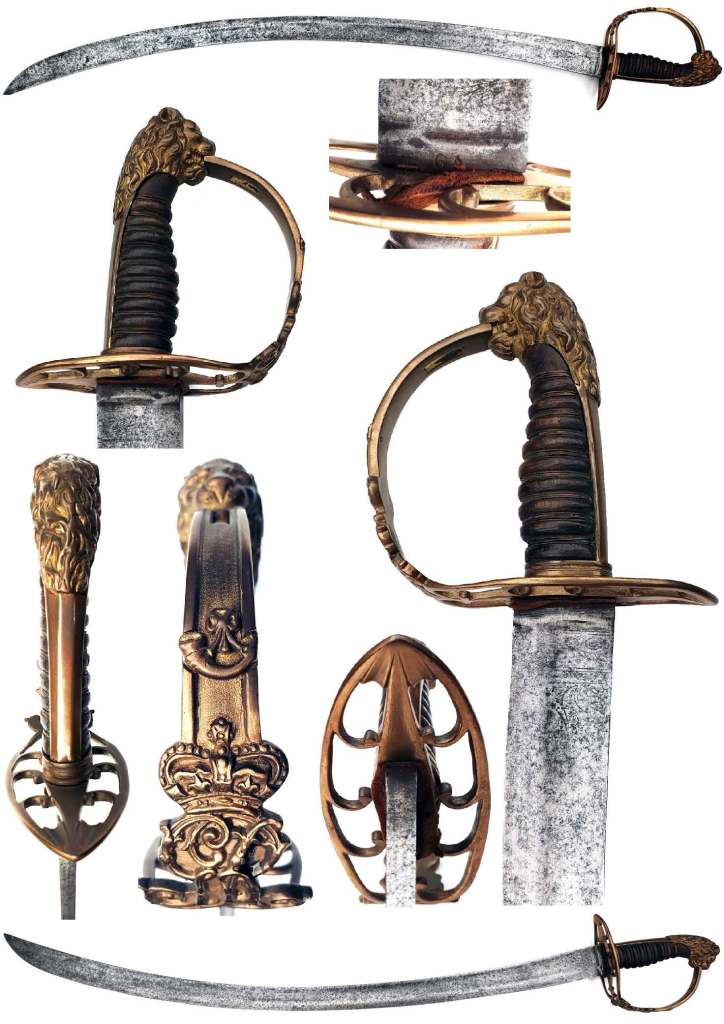 British 1803 infantry officer’s sword, curved blade with moderate staining, darker at the point, blue & gilt section of approx. 12″, with decorations of stand of flags & arms & cannon, no Royal Cypher; gilt decoration to forte; brass guard inset with GEORGE III CYPHER to knuckle bow & lion’s head back piece & pommel; ivory hilt with minor chipping & no binding.