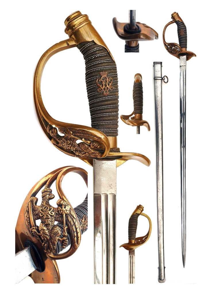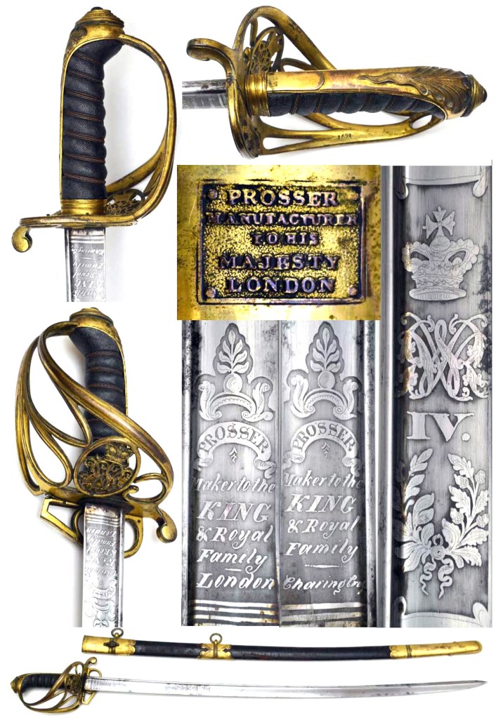 1822 British Pattern Infantry Officer’s Sword. Piped back blade by PROSSER with small areas of light staining; both sides of blade etched with Royal Cypher, William IV; ricasso marked PROSSER MAKER TO THE KING & ROYAL FAMILY LONDON on one side PROSSER MAKER TO THE KING & ROYAL FAMILY Charging Cross. Brass hilt inset with Royal Cypher with gilt finish wearing thin in places; fish skin grips bound with copper wire; complete with correct brass mounted, good leather scabbard with 2 hanging rings. The top Brass scabbard mount is engraved PROSSER MANUFACTURER TO HIS MAJESTY LONDON. A scarce & desirable sword.