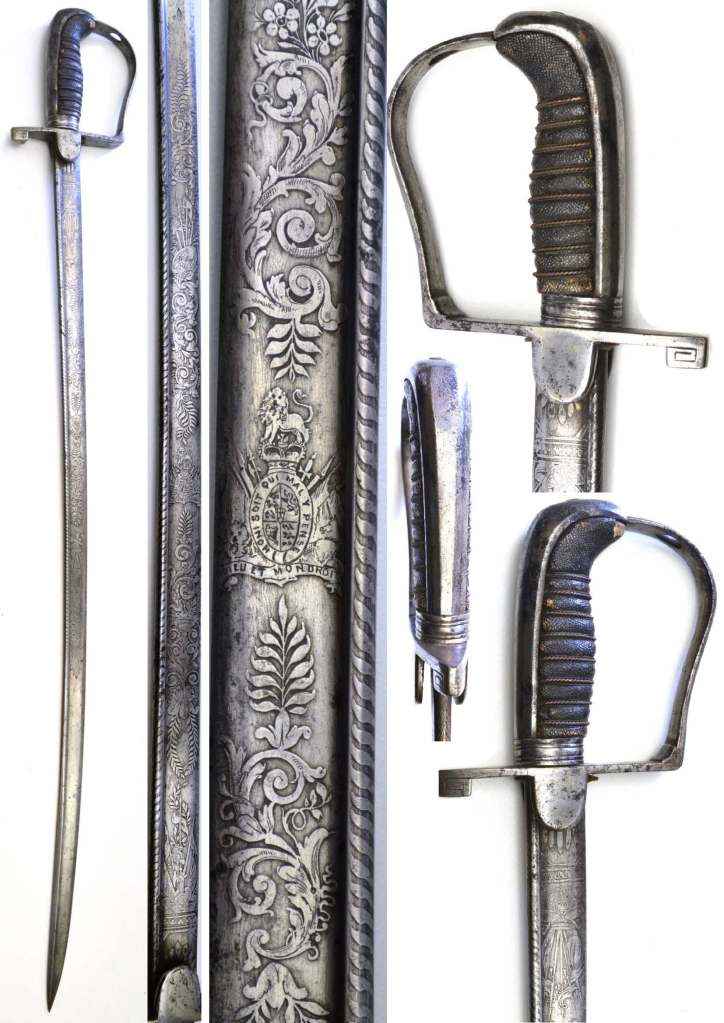 005-UK-Engineers-c1857-Scroll Officer’s Cameron E H-HW 16520Sword Henry Wilkinson No 16520, etched blade with owner’s crest and initials EHC Ewen Hay Cameron. Grip Shagreen, hilt has been lacquered to protect the gilding. Scabbard brass has one throat retaining screws missing from the throat mount and the drag on the bottom of the scabbard has worn through use.