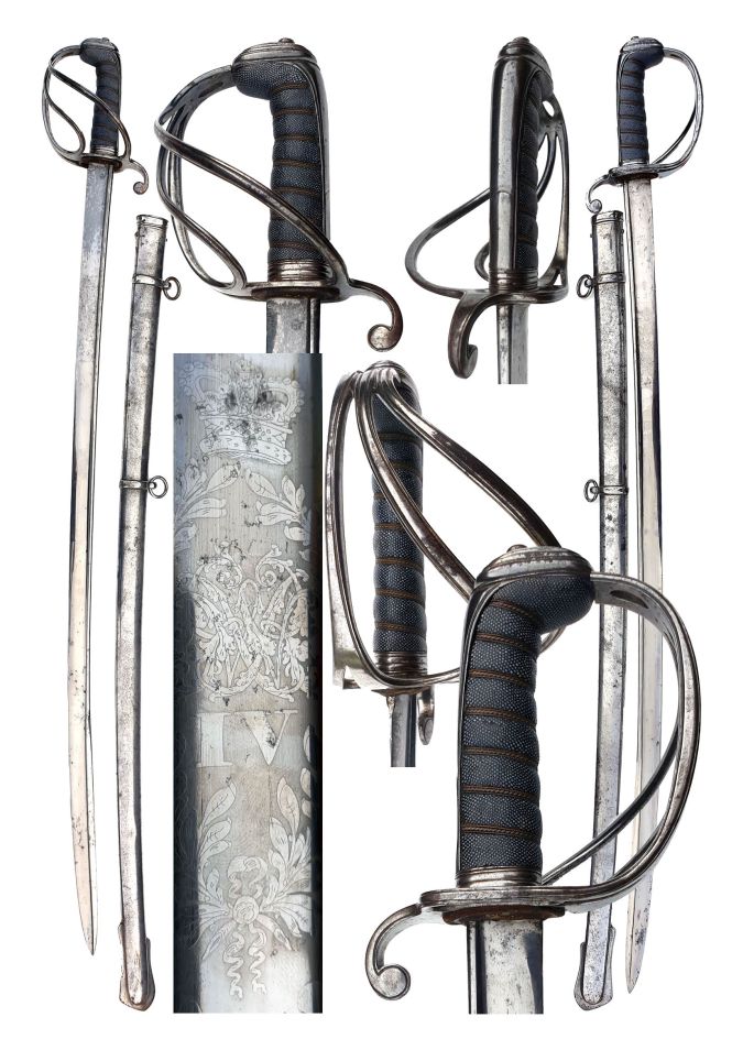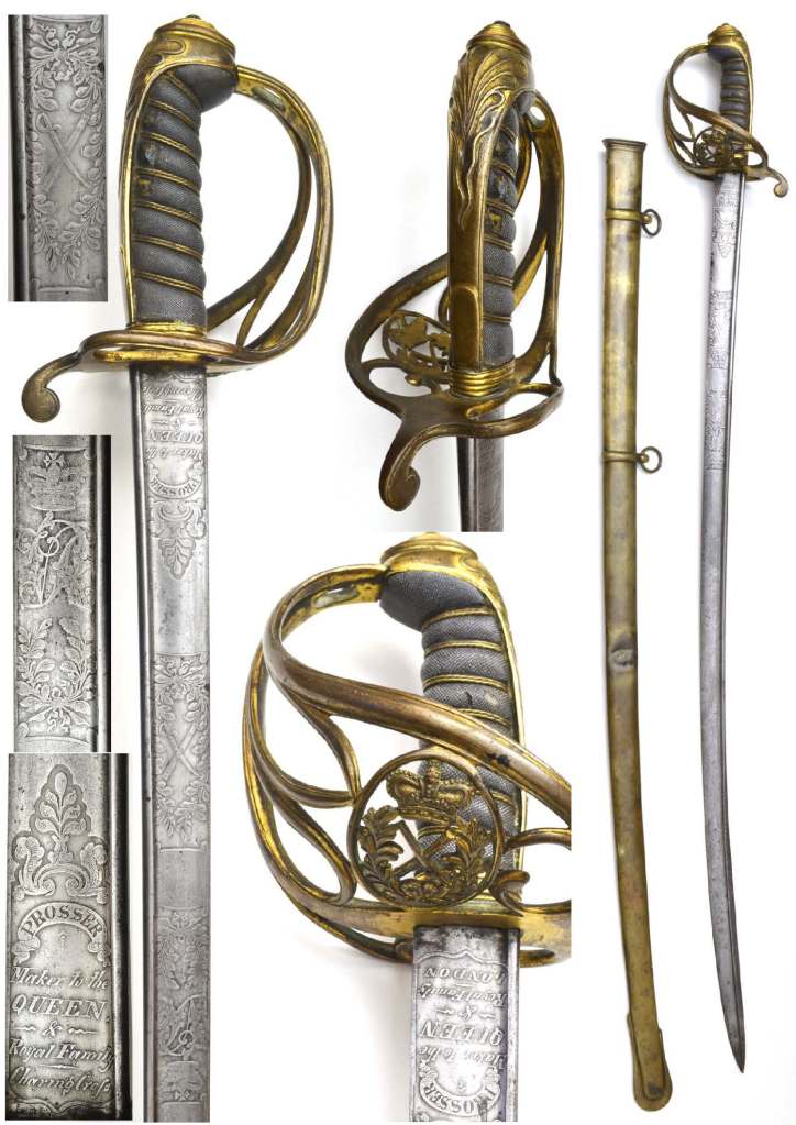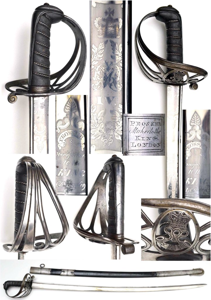 Pattern-British-Rifles 1827-Officer’s Prosser William 4th. British 1827 Pattern Rifle Regiment Sword, piped back blade with etched panels of ROYAL CYPHER & William IV; ricasso marked PROSSER MAKER TO THE KING & ROYAL FAMILY LONDON on one side PROSSER MAKER TO THE KING & ROYAL FAMILY Charging Cross. Steel basket with ROYAL CYPHER & strung bugle; fish skin grips bound with silver wire; complete with correct steel mounted scabbard, top mount engraved PROSSER MANUFACTURER TO THE KING LONDON. A Very good example of these hard to find swords.