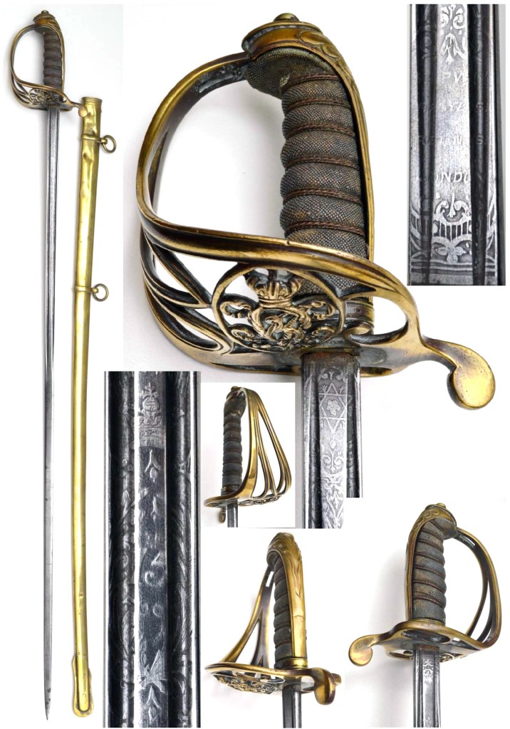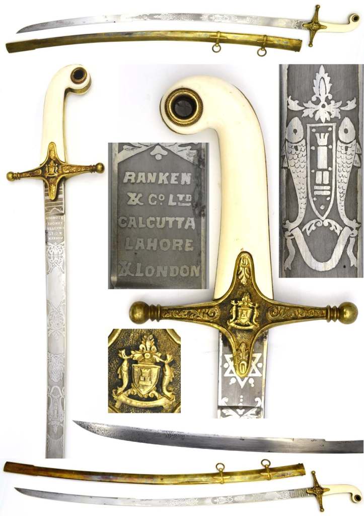 British 1831 General Officer’s Equerry Sword. BRITISH COLONIAL INDIA has a good 33″ curved blade etched with Bhopal Royal family crest of fish, shield & banners; ricasso inscribed RANKEN & CO LTD CALCUTTA LAHORE & LONDON; Gilt brass cross guard with Bhopal Royal family crest; ivory grips; complete with correct brass scabbard in very good condition.
