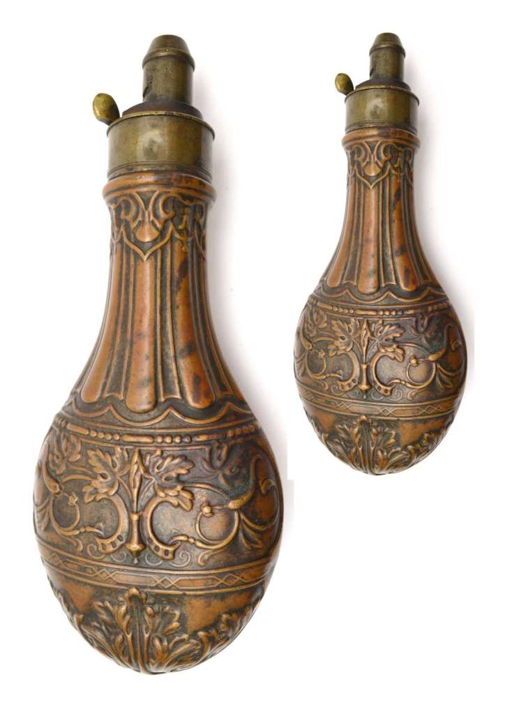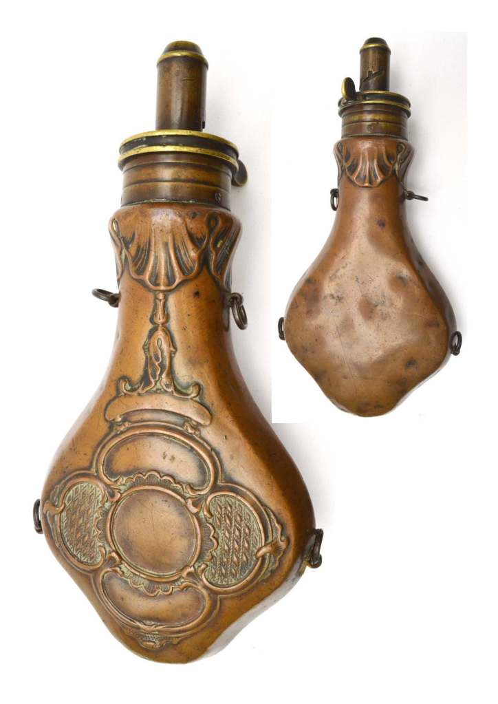 British Powder Flask Riling’s No: 670. Variant of 669, Form and decoration and introduces a broader panel at the swell to show crossed guns, shot belt pouch, flasks, hunting horn and palm sprays. The design is on both faces.