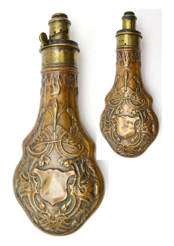 Powder Flask-R0550-English-Hawsley-Violin shape with Shield, graduated top 2 1/4 – 3 drams; panel with foliage & shield in the centre; g. dark patina to one side the other lightly cleaned; good. seams; a couple of .minor dents; 8 1/4″ o/a; all complete; G. W.O. Riling 550 with no hanging rings