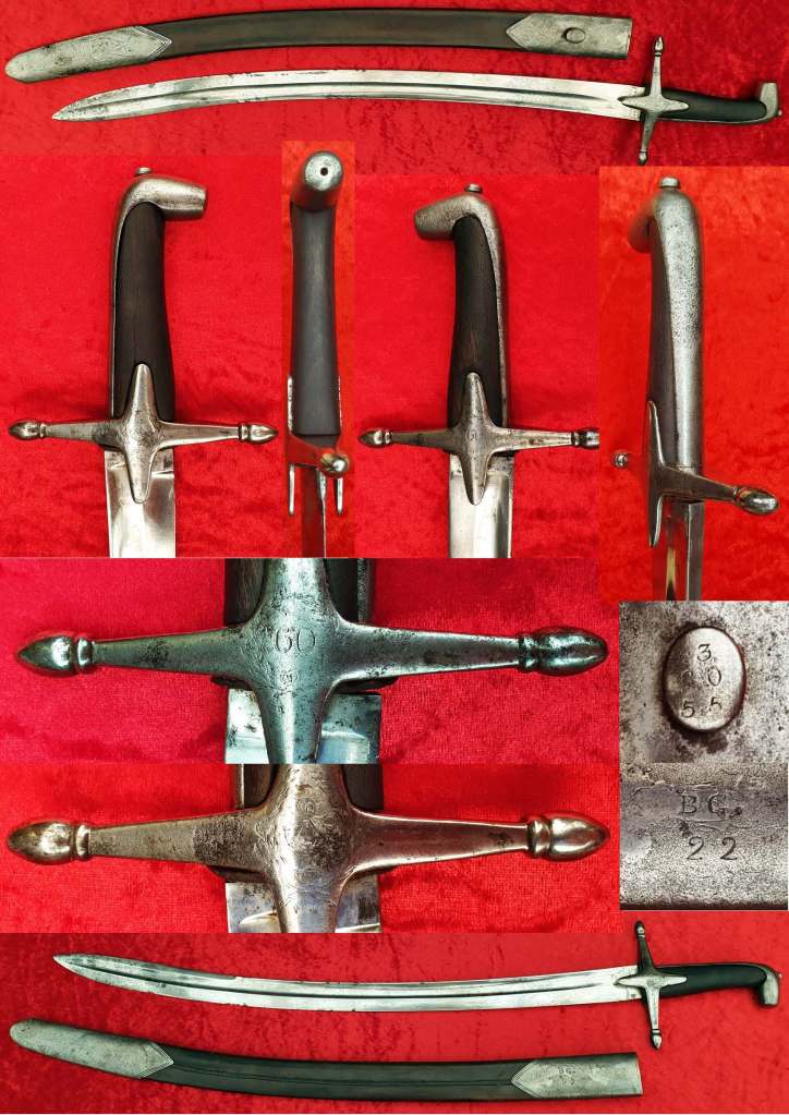 King’s Royal Rifle Corp 60th NCO Bandsman’s Sword Circa 1840. An identical sword is in the The Royal Green Jackets Museum. Mameluke sword engraved with Bugle in Floral Wreath on one side of cross guard, 60 in floral Wreath on the other side of cross guard. B.G. over 22 on one side of scabbard throat, 3 over 20 over 55 on frog. Stand of Arms on Drag. Black leather scabbard with steel mounts. The hilt has a beaked appearance with a strange hole in the end of the pommel. The grip is wood with no leather remaining