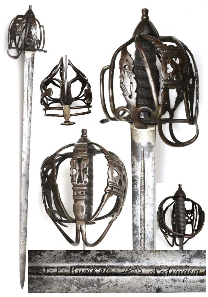 Scottish Steel Basket Hilt Sword: 33″ double edged blade marked RUNKEL SOLINGEN to both sides with areas of light & dark staining & short fullers; vg hilt &pommel with grey finish; vg fish skin grips bound with woven silver wire; good condition. From around 1778 to 1808 J J Runkel imported many thousands of swords and blades from Solingen for the British Market. From around 1800 the spelling of Solingen changed by the omission of the ‘h’ between the ó’and ‘l’. This sword is pre the introduction of the 1828 Infantry Pattern.