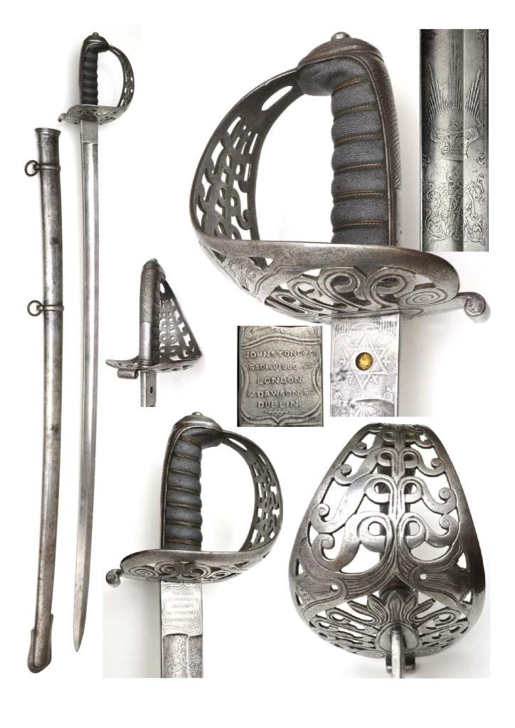 Early Victorian Heavy Cavalry Scroll hilted sword by Johnston & Co. Early style steeped pommel with half chequered back strap. Honeysuckle/scroll steel guard is deeply chiselled. The grip is fish skin with brass twist wire. The blade is of the Wilkinson style with one fuller for 2/3 rds and decorated with floral designs and the Victorian cypher and crown. The blade carries the makers details “JOHNSTONE & CO SACKVILLE ST LONDON & DAWSON ST DUBLIN “. There are numerous defensive nicks to the blade.