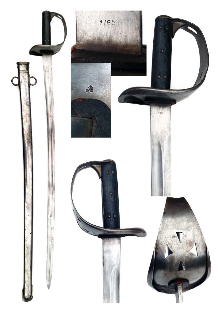 1885 trooper’s cavalry sword, steel bowl guard with Maltese cross leather chequered grips riveted either side to the tang. The blade is flat back with fuller being double edged for the last 10 inches and complete with matching steel scabbard please note dents below hanging rings. Guard is stamped WD & Broad arrow and the blade is stamped 9/85. No maker mark. Small vice scratches on the sides of the blade at the hilt.