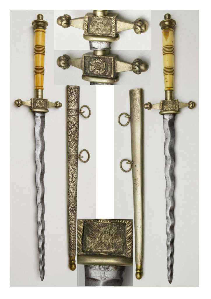 Dutch Naval Dirk. Turned ivory grip, well aged with small cracks and a possible repair. One side is much lighter in colour due to less exposure to light either through being worn or hung as a display item. Circular pommel, cross guard has acorn quillions, Tudor rose centre, 8 ½ “ flamboyant blade Flamboyant double edged blade has been heavily cleaned and possibly has a mark which looks like the letter H just below quillion block at the top of the blade. Chiselled steel sheath, floral design with two rings, 14 ½ “ (37 cm) o/a, c 1820 very good condition.