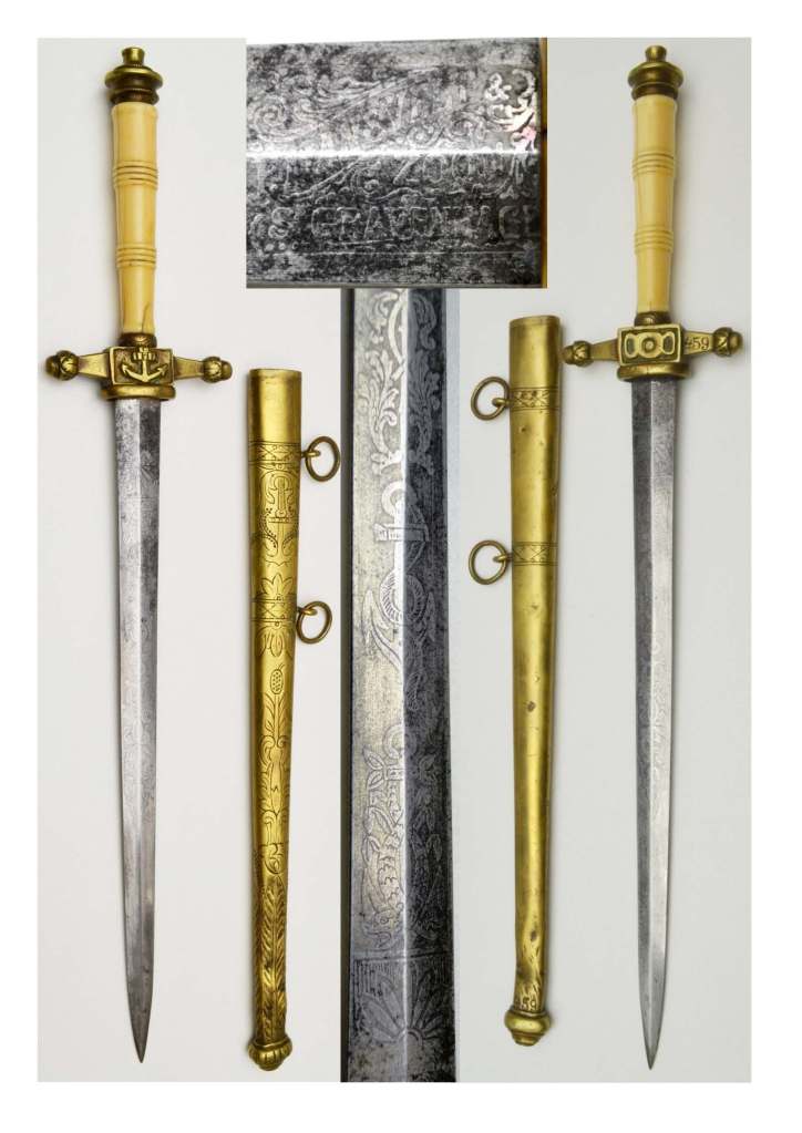 EUR-Naval-Dutch Naval Dirk Circa 1882. Turned ivory grip, well aged with one small crack. Circular pommel, cross guard has acorn quillons, Anchor in the centre on one side and a symbol on the other, blade is etched with Anchor design and floral decoration on both side and engraved “P MANSVELT ZOON S GRAVENHAGE”. The brass scabbard has two hanging rings and is engraved with Anchor and floral design on one side. The number 459 in engraved on the hilt and the scabbard.