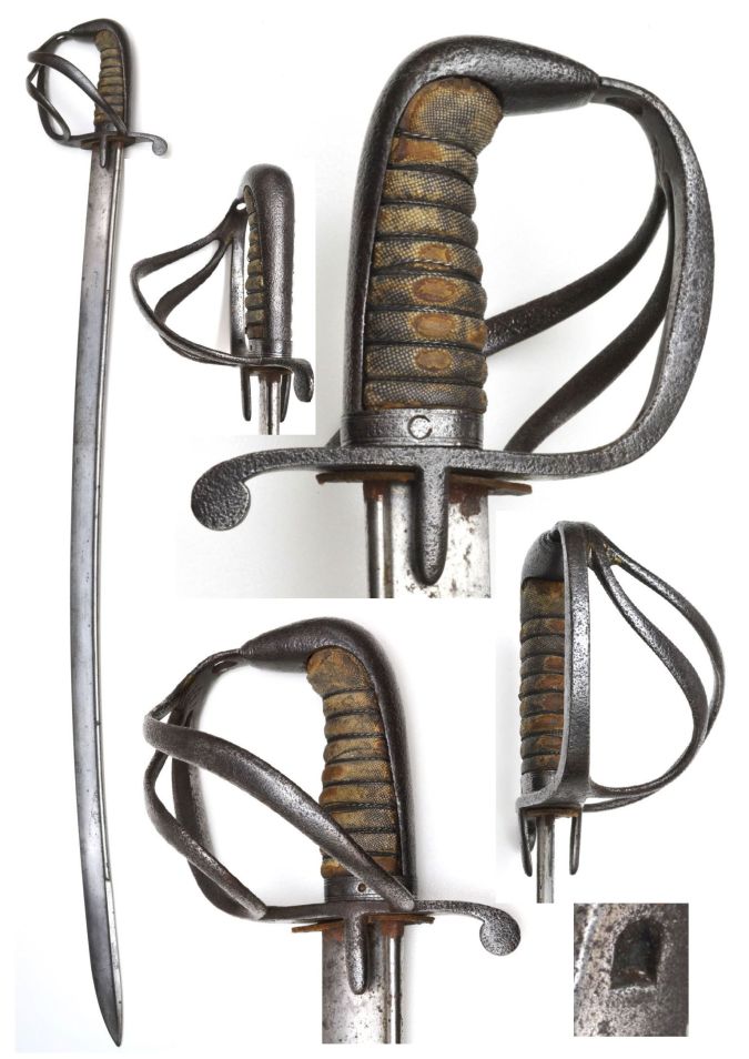 British Napoleonic Cavalry Officer’s Sword with extensive etched decoration to the blade. This is a fine and unusual example and includes a 1796 Pattern stirrup-type hilt of typical neo-classical style, particularly with regard to the squared quillon finial. The grip is covered in fishskin and bound with copper twist wire – all the original twist wire remains – small piece missing from fishskin near pommel. With shield-shaped hilt langet. The blade is of curved, pipe back and quill point form and is very much indicative of a late-Georgian military sword. It is decorated with a mixture of designs and motifs, including royal coat of arms, stands of trophies, victory laurels and scrolling foliage. The quality of the blade etching is excellent and still extremely crisp. No scabbard.