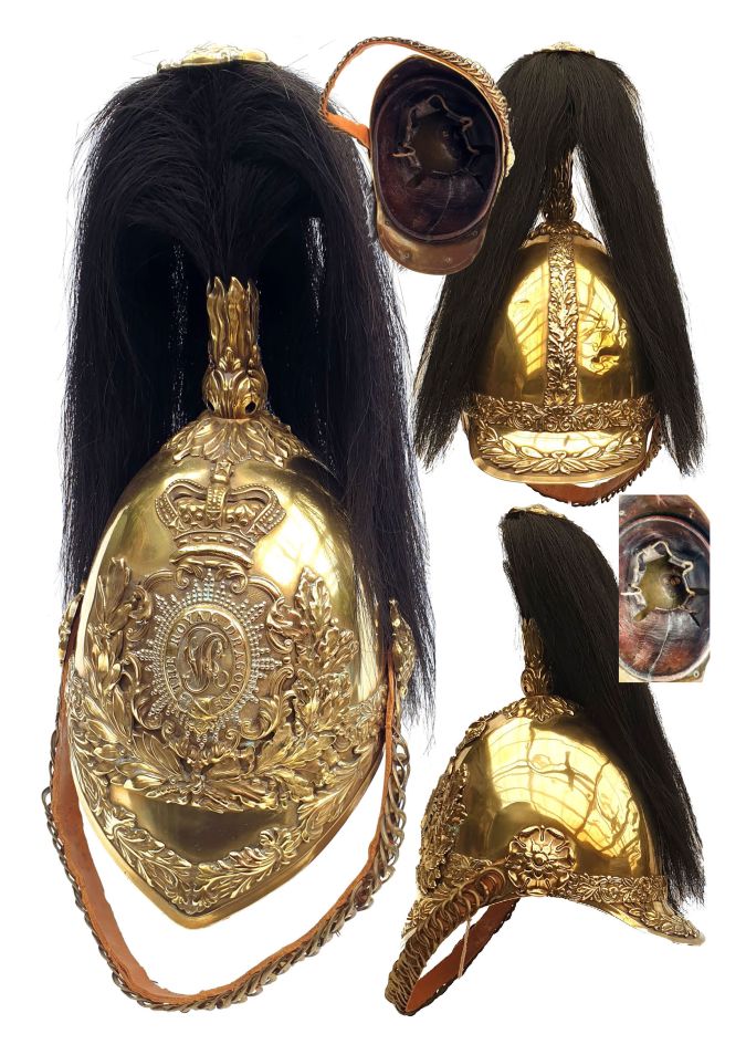 1st Royal Dragoon Officer’s 1847 Albert Pattern Helmet as described in the Regulations for the Dress of General Staff, and regimental Officers of the Army published in 1855. Gilt brass with a shield, a diamond cut silver star upon which is a garter bearing the title of the regiment, and encircling the cypher V.R. In excellent condition overall, has a small dent to the rear of the helmet.