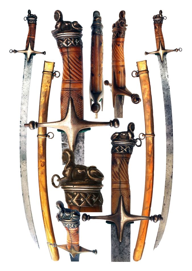 British officer’s sword clearly associated with the Egyptian campaign of 1801-02. The sword has an age cracked caved bone grip, small loss of bone near the pommel. Plain curved flat clip back blade with numerous nicks, gilt copper mounts including Eastern type cross-guard and pommel formed as fully moulded representation of the sphinx. Gilt copper scabbard with two suspension rings. Highly Unusual sword.