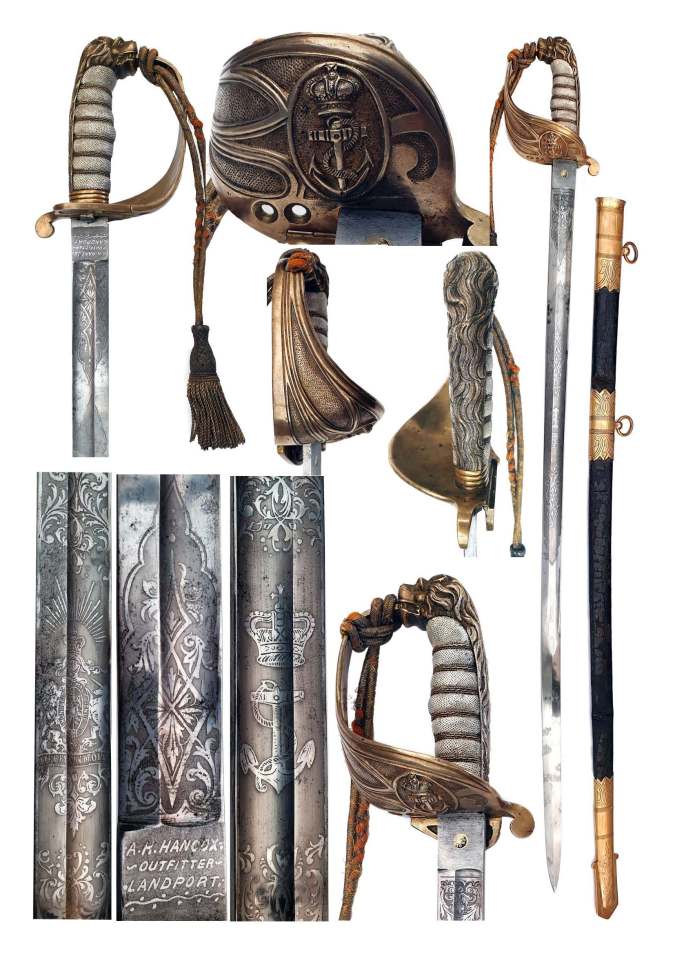 The sword is retailed by A.H. HANCOCK OUTFITTER LANDPORT, engraved on the blade with floral decoration, Royal Coat of Arms, Victorian Crown, and Anchor. The sword was sold by the family to I S Wright. The family provided the service records for their relative who they claimed was the original owner of the sword, who served on her Cerberus. The original owner was Shipwright Lieutenant Commander John Walker. Included with the sword were John Walkers Naval Records.