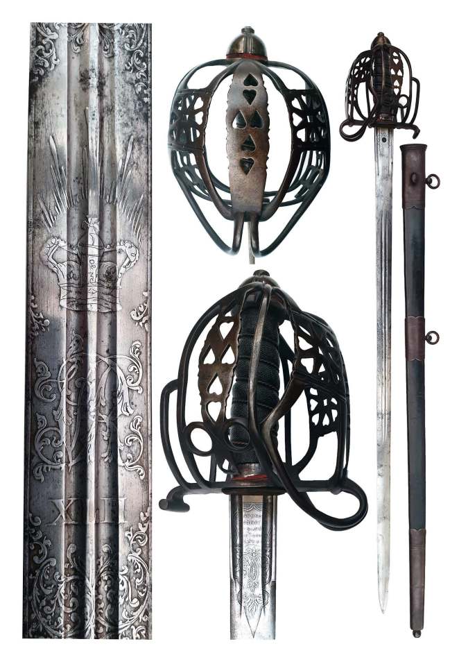 Gilt Brass hilt and D guard decorated with raised leaves. Floral finial and Langets decorated with military trophies and leaves. Ivory grip with carved decoration. Blade slightly curved with worn etched floral decoration and stands of arms. The blade is darker near the hilt indicating that it was probably blue and gilt in its early days. historically accurate handmade reproduction of the original by Mike Royle master restorer.