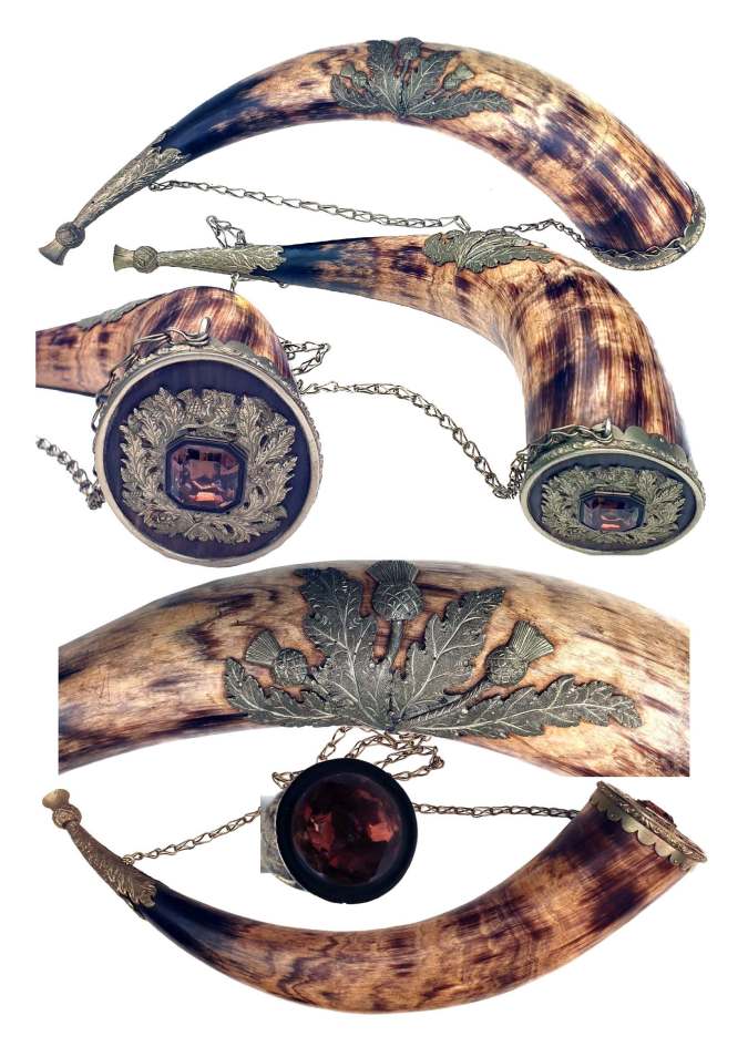 Ref014-UK-Powder Flask-Scottish-c1895-Horn, German Silver & CairngormScottish circa 1895 dress powder antler flask: cairngorm stopper plug & base; German silver mounts & large thistle & leaves to the centre; with German silver chain