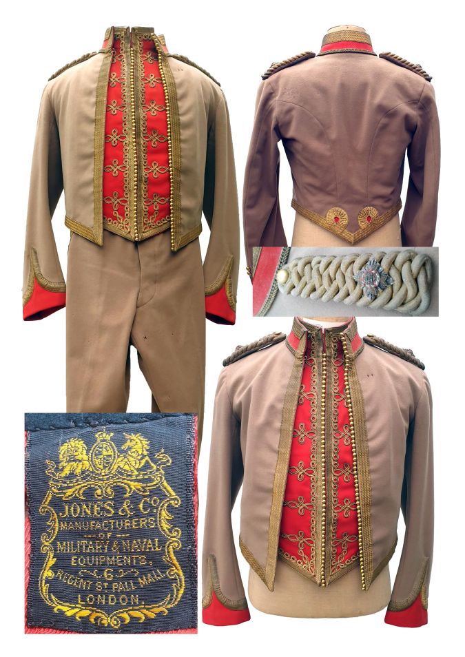 Pre-Federation South Australian Lancer Officers Mess Dress, including Jacket, waistcoat, and pants for a Second Lieutenant. Manufacturer “JONES & Co MANUFACTURERS OF MILITARY & NAVAL EQUIPMENT’S, 6 REGENT ST PALL MALL LONDON”.