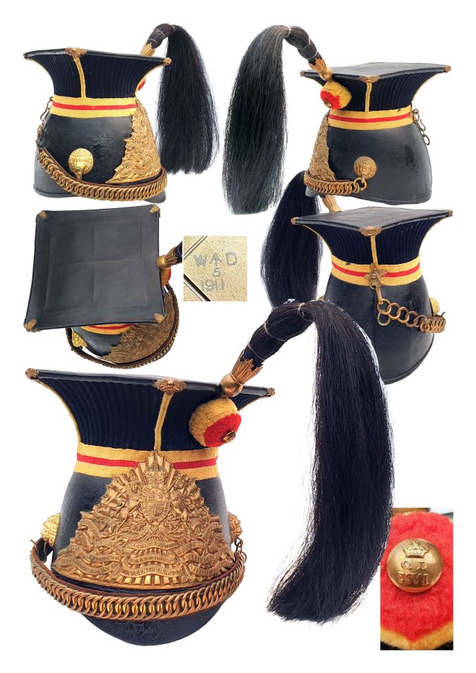16th (the Queen’s) Lancers Troopers Cap-1908 period. The boss button is a correct 16th Lancers King’s crown button. The yellow and red wool boss is correct for the 16th Lancers Trooper. The Helmet Plate is a King’s crown version with the last battle honour “South Africa 1900-1902”. The chin-chain is original. There are no signs of moth. There is crazing to the leather mortar board top, body and peak. Inside the helmet is a WD [War Dept] stamp and 1911 [The year] when the helmet was taken into service.